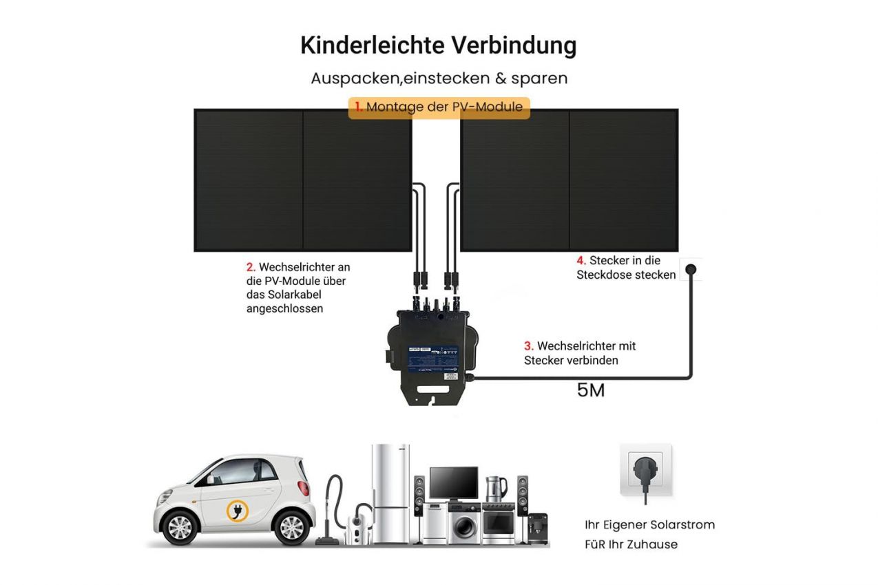 zwei Solarpanele wandeln die Sonnenenergie in elektrische Energie um. Der Wechselrichter erzeugt aus der Gleichspannung eine Wechselspannung und speist das in das Stromnetz in Ihrer Wohnung/Haus ein. Der produzierte Strom deckt den Standbyverbrauch im Haushalt. Ihre Ersparnis im Jahr kann bis zu 800 kWh betragen, welches ca. 280 € im Jahr entspricht. Nach zwei Jahren amotisiert sich die Anlage.