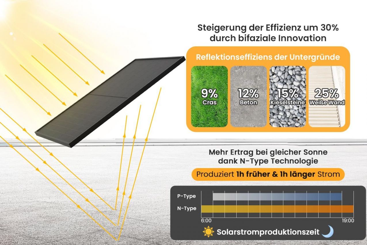 Bifaziale Solarzellen sorgen für eine maximale Stromproduktion. Sonnenstrahlen werden auch von der Rückseite aufgenommen. Ein hoher Wirkungsgrad und Robustheit sorgen für einen langen Stromertrag. Sie können von 30 Jahre Lebensdauer ausgehen ohne starke Performanceverluste.
